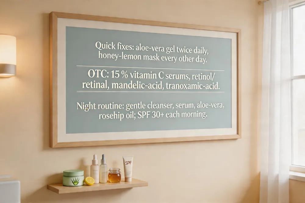 Nighttime routines for rapid improvement combine a gentle cleanser, a targeted serum (vitamin C or retinol), a thin layer of aloe‑vera, and a final seal with a nourishing oil such as rosehip seed oil to supply vitamins A, C, and E. Broad‑spectrum SPF 30+ sunscreen each morning protects newly regenerated skin from re‑pigmentation.