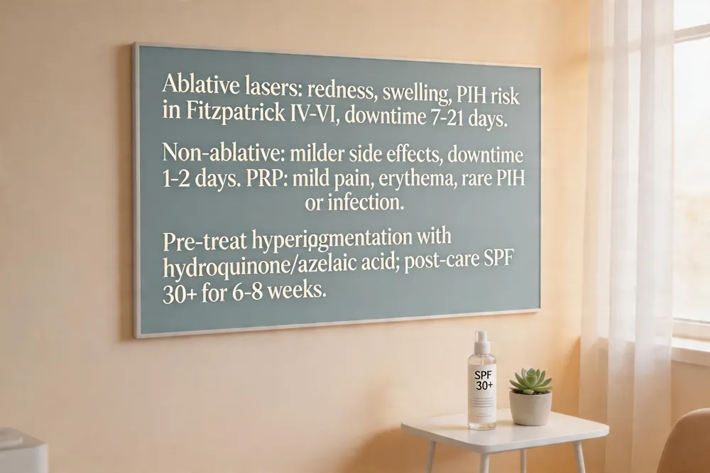 Laser resurfacing can cause temporary redness, swelling, bruising and, in some patients, post‑inflammatory hyperpigmentation (PIH) or hypopigmentation—especially in Fitzpatrick IV‑VI skin. Ablative CO₂ or Er:YAG lasers tend to have longer downtime (up to 10‑21 days) and higher pigment‑change risk, while non‑ablative fractional lasers (1550 nm Er:glass, Nd:YAG) usually resolve within a few days and are safer for darker tones. Platelet‑rich plasma (PRP) is well tolerated; most people notice mild pain, erythema, swelling, bruising or itching that fades within 1‑3 days. Rarely, PRP can trigger PIH in darker skin or cause infection if aseptic technique is breached. To manage hyperpigmentation, pre‑treat with topical hydroquinone or azelaic acid for 4‑6 weeks and choose non‑ablative or low‑fluence settings. Post‑procedure care includes gentle cleansing, fragrance‑free moisturizers, and broad‑spectrum SPF 30+ applied daily for at least 6‑8 weeks. Downtime varies: ablative lasers need 7‑14 days of redness and peeling; non‑ablative lasers and PRP require only 1‑2 days. Follow your dermatologist’s protocol to minimize complications and promote optimal collagen remodeling.