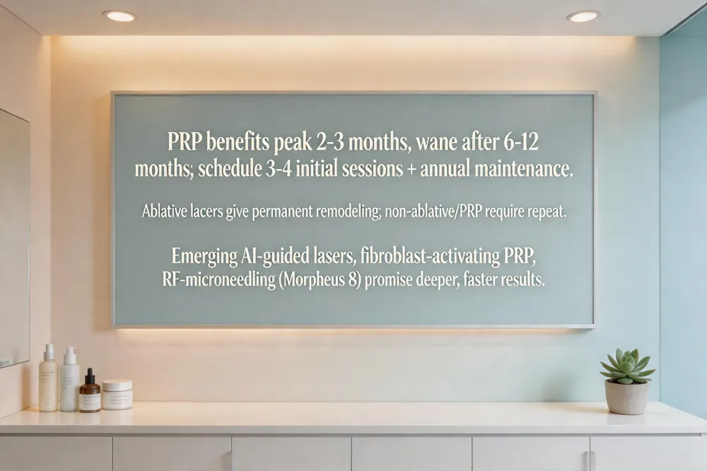 Acne‑scar therapy is a multi‑step journey that balances lasting improvement with realistic expectations. Platelet‑rich plasma (PRP) stimulates collagen remodeling, but its visible benefits peak at 2–3 months and typically wane after 6–12 months; most clinicians schedule 3–4 initial sessions spaced 4–6 weeks apart and recommend annual maintenance to preserve smoother skin. Unlike ablative laser resurfacing which can produce permanent tissue changes once collagen is fully remodeled, PRP and non‑ablative lasers offer temporary gains that depend on ongoing care and repeat treatment. In 2026, the most exciting advances combine AI‑guided fractional lasers that map each scar in real time with biologic‑rich topicals and a single‑session regenerative injectable (e.g., fibroblast‑activating PRP or stem‑cell‑derived serum). A parallel breakthrough is radio‑frequency‑enhanced microneedling (e.g., Morpheus 8), which delivers deeper collagen stimulation with minimal downtime and is now a first‑line option for rolling and boxcar scars. While no modality can guarantee 100 % scar removal, an individualized plan that layers laser, PRP, microneedling, and vigilant sun protection offers the best chance at near‑permanent, natural‑looking results.