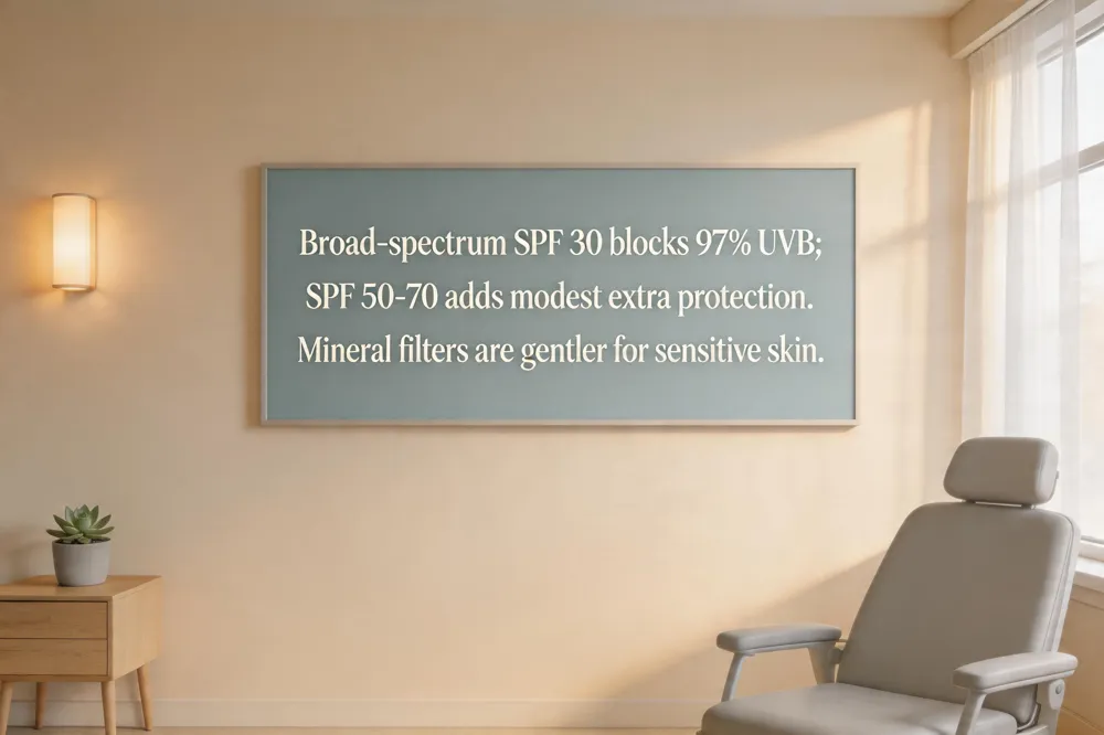 SPF (Sun Protection Factor) measures how much UVB radiation a sunscreen blocks; SPF 30 filters about 97 % of UVB, while SPF 50 blocks roughly 98 %. Dermatologists require broad‑spectrum protection meaning the product also shields against UVA rays that cause aging and inflammation. The American Academy of Dermatology recommends a minimum broad‑spectrum SPF 30 for daily use, with higher numbers (SPF 50‑70) offering modest extra UVB protection for very fair or photosensitive skin.