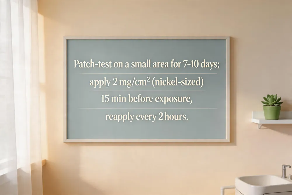Patch‑testing a new sunscreen is essential for reactive skin. Apply a pea‑sized amount to a discreet area (e.g., behind the ear or inner forearm) twice daily for 7‑10 days; any redness, itching, or swelling indicates a potential irritant and the product should be avoided. For optimal protection, use a nickel‑sized dollop (≈2 mg/cm²) for the face and neck 15 minutes before sun exposure, then reapply every two hours or after swimming, sweating, or towel‑drying. Apply sunscreen as the final step of your routine, after a fragrance‑free moisturizer but before makeup, to lock in hydration and ensure an even barrier.