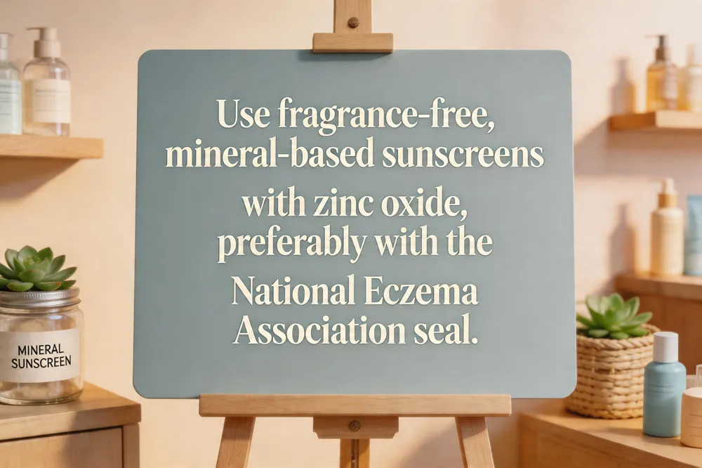 Patients with eczema should choose a mineral‑based, broad‑spectrum sunscreen that contains zinc oxide or titanium dioxide, is fragrance‑free, alcohol‑free, and ideally bears the National Eczema Association Seal of Acceptance. EltaMD UV Clear Broad‑Spectrum SPF 30 (or SPF 50) meets these criteria and is lightweight enough for daily facial use. Other dermatologist‑approved options include Babo Botanicals Super Shield SPF 50, Badger Unscented Active Mineral Stick SPF 35, and Blue Lizard Sport Mineral SPF 50—each formulated with only mineral filters and no known irritants. Apply a nickel‑sized amount to the face and neck, reapply every two hours or after swimming/sweating, and follow with a fragrance‑free moisturizer to support the skin barrier.