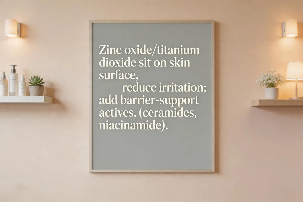 Mineral (physical) sunscreens rely on zinc oxide and titanium dioxide to reflect and scatter UVA and UVB radiation. These filters sit on the skin surface, provide broad‑spectrum protection, and are far less likely to cause irritation or allergic contact dermatitis than many chemical absorbers. Because they are non‑comedogenic, they do not clog pores, making them ideal for acne‑prone and reactive skin. Fragrance‑free, dye‑free and paraben‑free formulations further reduce the risk of flare‑ups. Adding barrier‑support ingredients—ceramides, niacinamide, hyaluronic acid, centella asiatica, or panthenol—helps maintain hydration, calm redness, and protect the skin’s natural barrier against UV‑induced inflammation.