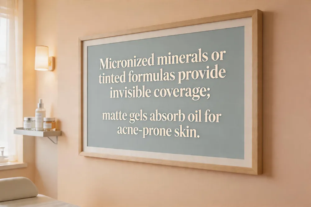 Tinted mineral sunscreens are ideal for people who want to neutralize redness while still protecting their skin. Formulas such as EltaMD UV Skin Recovery Red Color Correcting SPF 50 blend zinc oxide with centella asiatica and niacinamide, offering a subtle green tint that soothes irritation and evens tone without a heavy white cast. Micronized zinc oxide or titanium dioxide particles further reduce visibility; products like Supergoop! Unseen Sunscreen SPF 50 or Tatcha The Silk Sunscreen SPF 50 use ultrafine minerals that sit on the skin surface yet disappear on all skin tones, delivering broad‑spectrum protection without the chalky finish.