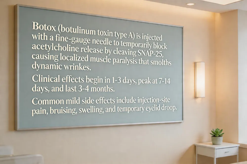 Botox injections are a purified form of botulinum toxin type A (or B) administered by a licensed provider with a fine‑gauge needle to temporarily relax targeted facial muscles. The toxin’s heavy chain binds to presynaptic cholinergic nerve terminals and via endocytosis delivers its light chain, a zinc‑dependent protease that cleaves the SNARE protein SNAP‑25. This cleavage blocks vesicle fusion and prevents acetylcholine release at the neuromuscular junction, halting the signal that triggers muscle contraction. The resulting localized paralysis smooths dynamic wrinkles—frown (glabellar) lines, crow’s feet, and forehead creases—by reducing repetitive facial movements. Clinical effects typically begin within 1‑3 days, reach peak smoothness around 7‑14 days, and last 3‑4 months before nerve terminals regenerate and muscle activity returns. Common mild side effects include injection‑site pain, bruising, swelling, and temporary eyelid droop; rare systemic spread can cause muscle weakness or vision changes. Patients should disclose pregnancy, neuromuscular disorders, and blood‑thinner use before treatment.