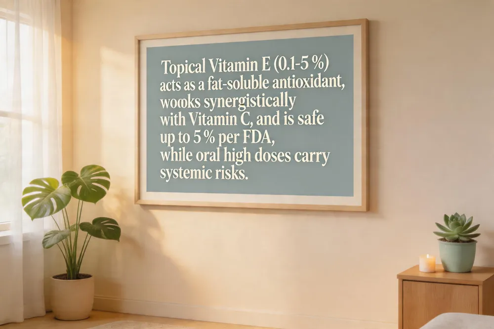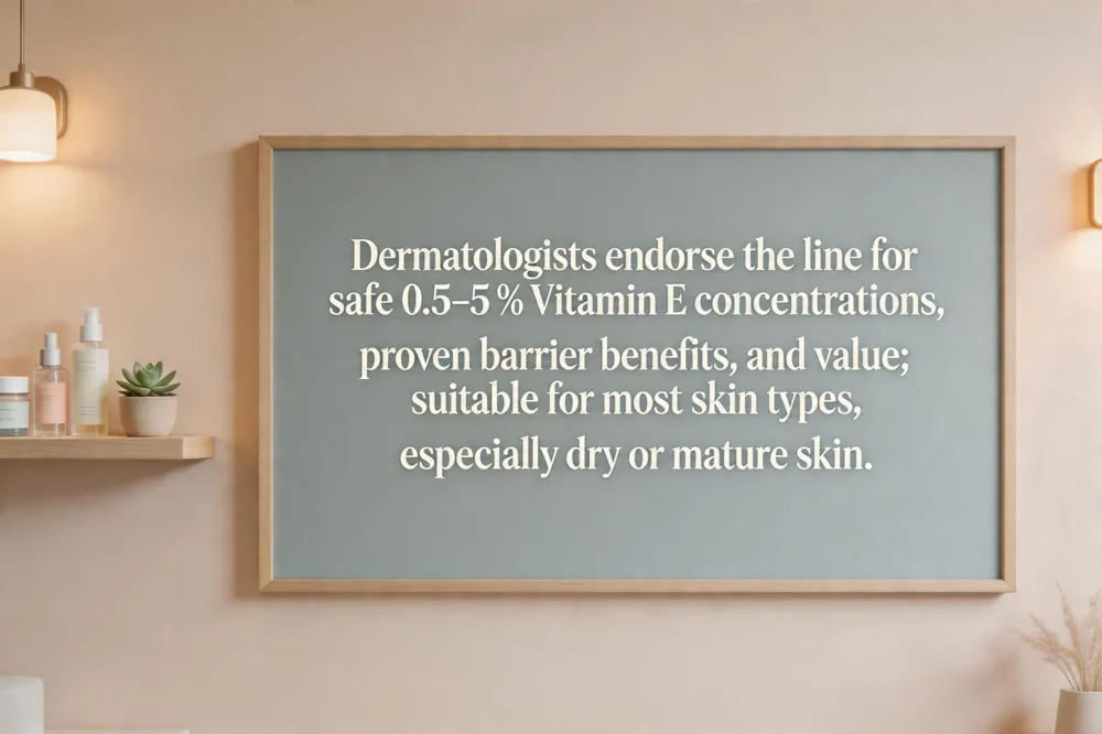 Dermatologists recommend 0.1%‑5% vitamin E for safety and efficacy; Derma Made’s serum (≈10%) uses liposomal delivery to enhance penetration while staying within safe limits. FDA deems vitamin E safe in concentrations up to 5% in OTC cosmetics.
