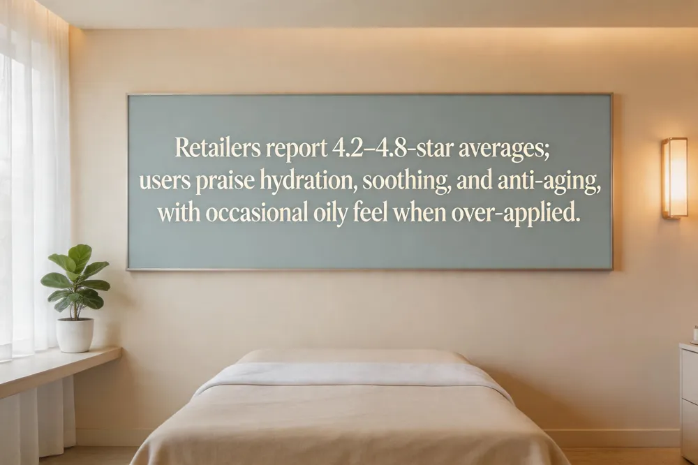 Consumer sentiment is strong: major retailers list average ratings between 4.2 and 4.8 stars, with reviewers praising hydration, soothing of redness and suitability for sensitive skin. A few users note a slight oily feel when over‑applied, underscoring the importance of patch‑testing for acne‑prone individuals.