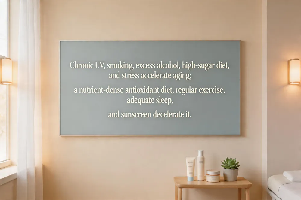 Premature aging appears when fine lines, deep wrinkles, age spots, loss of elasticity and uneven tone show up earlier than expected. The chief culprits are extrinsic stressors—chronic UV exposure (including UVA that penetrates glass), smoking, excessive alcohol, high‑sugar diets, and persistent stress—all of which trigger oxidative damage and activate matrix‑metalloproteinases that break down collagen and elastin. Protecting the skin with a broad‑spectrum SPF 30+ sunscreen every day, quitting smoking, limiting alcohol, and adopting a nutrient‑dense, antioxidant‑rich diet can markedly slow this process. In the 40s, a robust anti‑aging routine adds a medical‑grade moisturizer containing hyaluronic acid or ceramides, a nightly retinol or vitamin C serum to stimulate collagen, and regular exercise (both cardio and strength) to improve circulation and muscle tone. Adequate sleep and a stable circadian rhythm further support skin repair. To keep skin young and wrinkle‑free, combine daily sunscreen, gentle cleansing, and barrier‑supporting moisturizers with proven actives like retinol, vitamin C, niacinamide, or bakuchiol. Hydration, balanced nutrition, stress management, and avoidance of smoking and excess alcohol are essential lifestyle pillars. Schedule routine visits with a board‑certified dermatologist for personalized skin‑care plans and professional treatments such as chemical peels or laser resurfacing when needed.