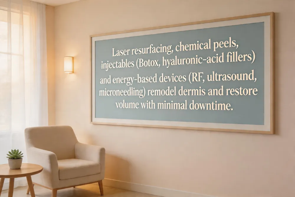 Injectables—Botox for neuromodulation of dynamic wrinkles and hyaluronic‑acid dermal fillers for volume loss—address both muscular and static changes. Botox temporarily relaxes facial muscles, preventing deeper lines, while fillers restore lost sub‑cutaneous fat, smoothing nasolabial folds and marionette lines.