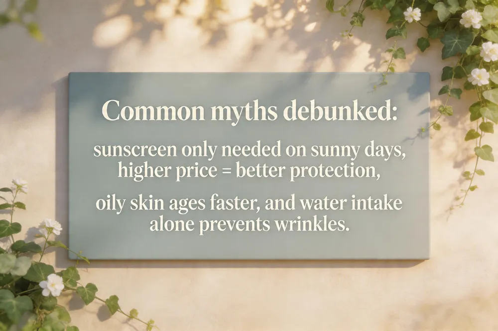 Common myths about skincare Misconceptions include: sunscreen only on sunny days, higher price guaranteeing efficacy, oily skin not needing moisturizer, daily exfoliation being harmless, and antibacterial soaps being necessary for routine cleaning. Each myth is refuted by clinical evidence.