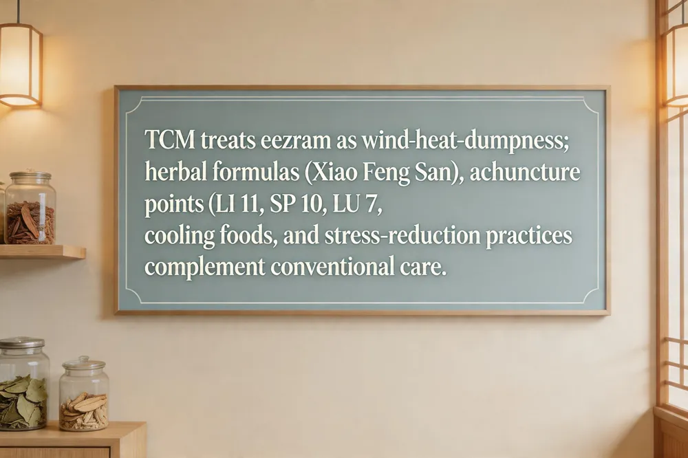 Traditional Chinese Medicine (TCM) views eczema as a manifestation of wind, heat, and dampness disrupting the skin’s barrier and Qi flow. Practitioners often prescribe herbal formulas such as Xiao Feng San (Clear Wind Powder) to dispel wind, clear heat, and resolve dampness, sometimes adding ingredients like Huang Qi or Bai Xian Pi for skin repair. Topical washes and balms made from herbs (e.g., Ophiopogonis, Angelica, licorice) are applied to soothe itching and reduce inflammation. Acupuncture or acupressure points (LI 11, SP 10, LU 7) are selected to calm pruritus, improve micro‑circulation, and support immune balance. Lifestyle integration includes dietary guidance—avoiding spicy, fried, and dairy foods that aggravate heat‑damp patterns, favoring cooling, moistening foods such as pears, mung beans, and leafy greens—and stress‑reduction practices like tai chi, meditation, and adequate sleep.