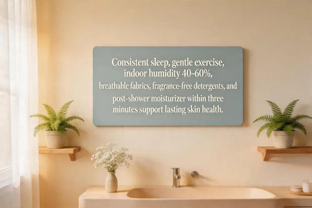 Good sleep hygiene is a foundation for eczema control. Aim for consistent bedtime and wake‑time, limit evening screen exposure, and get a short dose of morning sunlight to reinforce the circadian rhythm; adequate rest lowers pro‑inflammatory cytokines and improves skin barrier repair. Regular low‑impact exercise such as walking, yoga, or gentle cycling reduces systemic inflammation and cortisol spikes while supporting circulation to the skin. Indoor humidity should be kept between 40 %‑60 % with a humidifier, especially in heated winter rooms, and indoor temperature maintained at a comfortable 68‑72 °F to prevent excess drying or sweating that can aggravate flare‑ups. Stress‑reduction practices—including mindfulness meditation, deep‑breathing exercises, and maintaining strong social connections—have been shown to dampen inflammatory pathways linked to eczema. Choose soft, breathable fabrics (100 % cotton or bamboo), wash new clothes before wearing them, and use fragrance‑free, dye‑free detergents and non‑soap, pH‑balanced cleansers. After a lukewarm shower, pat skin dry and lock in moisture with a fragrance‑free, ceramide‑rich moisturizer within three minutes to seal the barrier and keep inflammation at bay.