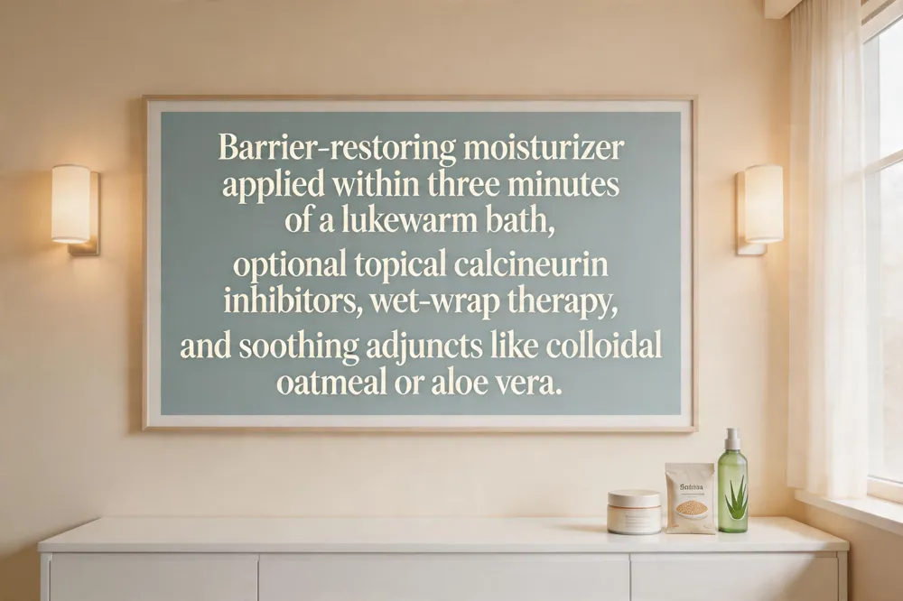 A steroid‑free approach starts with barrier‑restoring moisturizers. Apply a thick, fragrance‑free ointment or cream that contains ceramides, colloidal oatmeal, or hyaluronic acid within three minutes of a lukewarm bath while the skin is still damp—the "Rule of 3" timing that locks in moisture and curtails transepidermal water loss. For inflamed patches on the face, neck, or flexural areas, topical calcineurin inhibitors such as 1 % tacrolimus or 1 % pimecrolimus can be prescribed; they suppress type‑2 cytokines without the thinning risk of steroids. When a flare is extensive, wet‑wrap therapy offers intensive hydration: after a layer of moisturizer, cover the area with a damp gauze or cotton garment, then add a dry layer for 6–12 hours to soothe itch and reduce inflammation. Oral antihistamines may aid nighttime sleep, and soothing adjuncts—colloidal oatmeal baths, aloe vera gel, or a diluted tea‑tree oil rinse—can provide extra comfort. If symptoms persist, a dermatologist may consider phototherapy or short‑term non‑steroidal systemic agents under supervision.