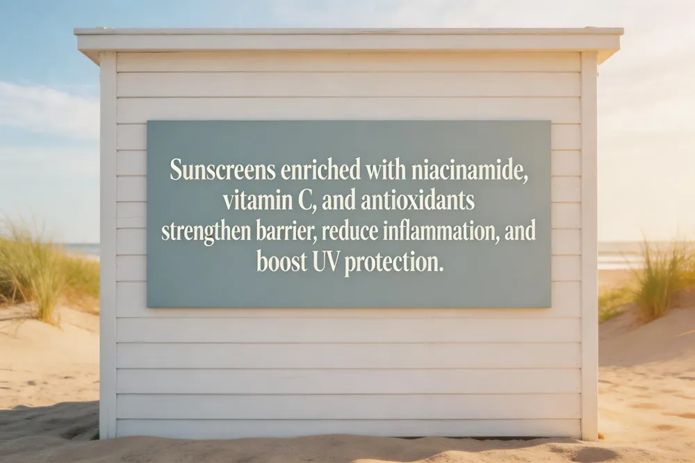 Niacinamide‑enriched sunscreens give sensitive skin a dual advantage. The vitamin B3 derivative boosts the barrier by increasing ceramide synthesis, improving moisture retention and soothing inflammation—key for eczema‑prone or rosacea‑sensitive patients. When paired with broad‑spectrum UV filters, it also supports antioxidant defenses, neutralizing free‑radical damage that UV exposure generates. Formulations that combine niacinamide with other barrier‑supporting actives such as hyaluronic acid, centella asiatica, or panthenol further reinforce skin resilience and reduce the risk of post‑sun irritation. Dermatologists note that the soothing properties of niacinamide can lessen the stinging sensation sometimes reported with mineral sunscreens, encouraging consistent use. In practice, a sunscreen containing niacinamide not only protects against UVA/UVB but also helps prevent premature aging, redness and hyperpigmentation, making it a valuable addition to a sun‑care regimen.