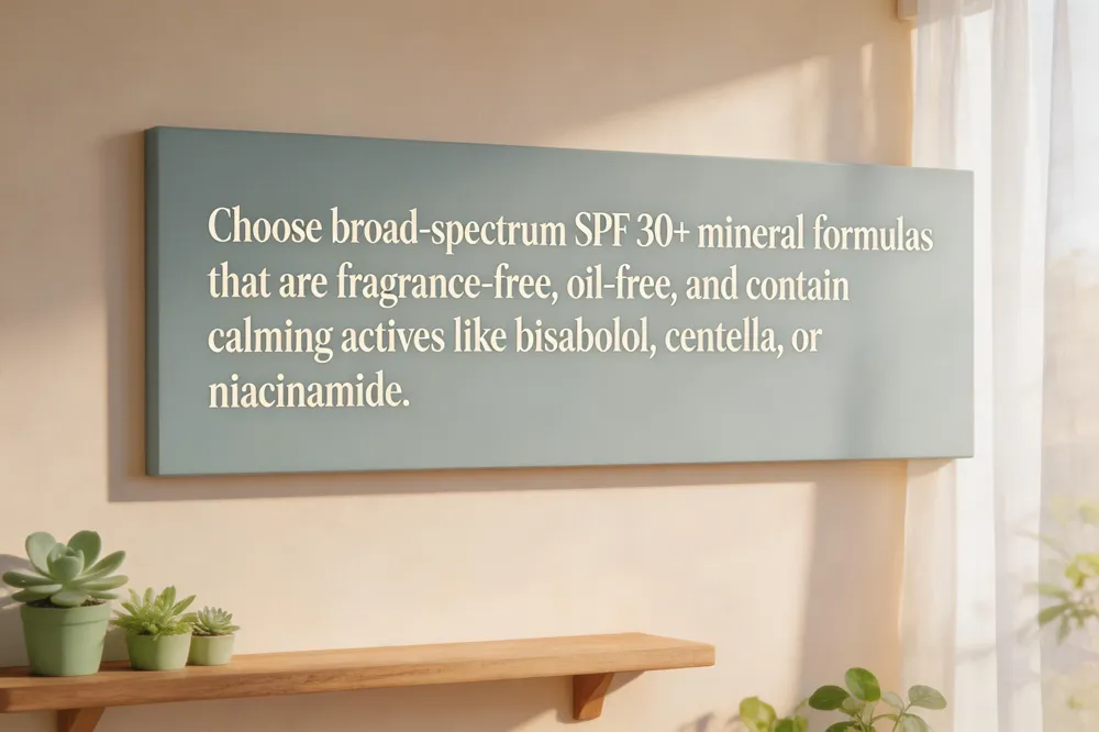 Non‑nano zinc oxide or titanium dioxide mineral sunscreens are the safest option because they sit on the skin surface, reflect UV rays, and do not penetrate the barrier. Choose fragrance‑free, hypoallergenic formulas that add soothing actives such as oat extract, honey, aloe, ceramides, or Centella asiatica to reinforce the skin barrier and reduce redness.