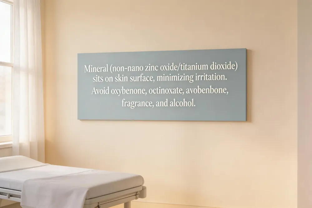 Sensitive skin tolerates mineral (physical) filters best because zinc oxide and titanium dioxide sit on the surface, reflect and scatter UV radiation, and rarely penetrate the barrier. Choose non‑nano zinc oxide or titanium dioxide, fragrance‑free, dye‑free, and non‑comedogenic formulas. Many dermatologists recommend added calming agents such as bisabolol, ceramides, centella asiatica, or licorice root to further reduce redness and support the skin barrier.