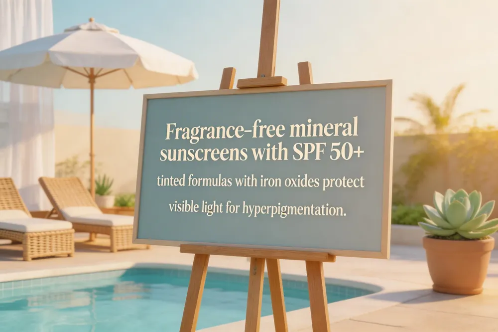 Hyperpigmentation is driven by UVA and visible light. Tinted mineral sunscreens that contain iron oxides block visible light and reduce the white cast of traditional zinc‑oxide products. Dermatologist‑recommended choices include EltaMD UV Skin Recovery Red Color‑Correcting Tint SPF 50 and SkinCeuticals Physical Fusion UV Defense SPF 50, both of which add antioxidants such as niacinamide to further prevent new pigment formation. Apply after moisturizer, using a nickel‑sized amount for the face, and reapply every two hours for optimal protection.