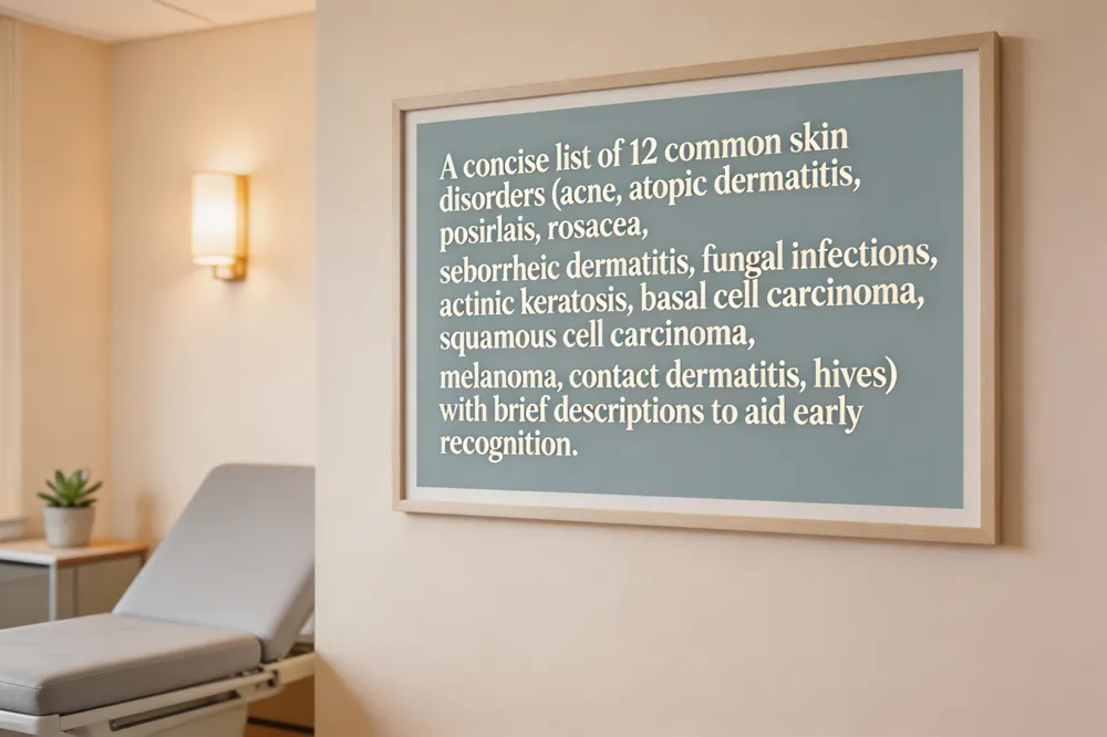 The twelve widely encountered skin conditions are: 1) Acne vulgaris; 2) Atopic dermatitis (eczema); 3) Psoriasis; 4) Rosacea; 5) Seborrheic dermatitis; 6) Fungal infections (tinea corporis, tinea pedis, tinea capitis); 7) Actinic keratosis; 8) Basal cell carcinoma; 9) Squamous cell carcinoma; 10) Melanoma; 11) Contact dermatitis; and 12) Hives (urticaria). Recognizing these disorders helps patients seek timely evaluation and treatment.