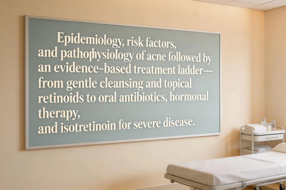 Evidence‑based treatment ladder – Initial therapy starts with gentle cleansing, topical retinoids, and benzoyl peroxide. Moderate disease may require oral antibiotics or hormonal agents such as combined oral contraceptives or spironolactone. Severe or refractory acne is treated with isotretinoin under strict monitoring. Adjunctive measures include non‑comedogenic moisturizers, sun protection, and lifestyle counseling to reduce triggers and scarring.