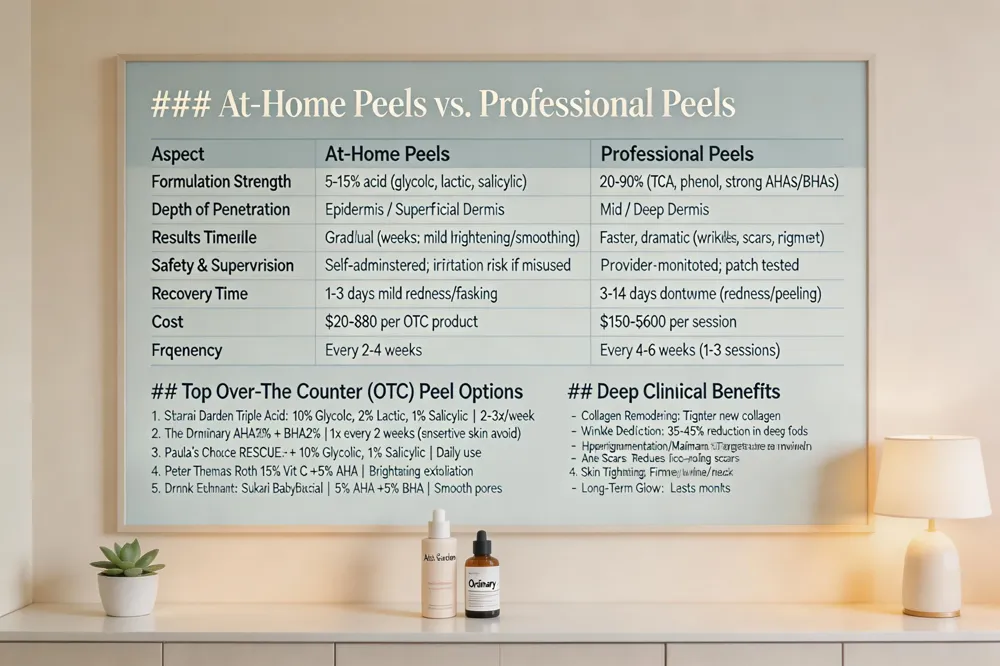 At‑home peels vs. professional peels Home‑use formulas are typically‑ in strength (5‑15% glycolic, lactic, or salicylic acid) and are designed for mild exfoliation, brightening, and gradual texture improvement. They are ideal for patients who want a low‑maintenance routine and can tolerate a short period of mild redness. Professional peels, administered by a board‑certified dermatologist, can range from superficial (20‑30% glycolic acid) to medium (35‑50% TCA) and deep (phenol) concentrations, delivering faster and more dramatic resurfacing but requiring varying recovery times.