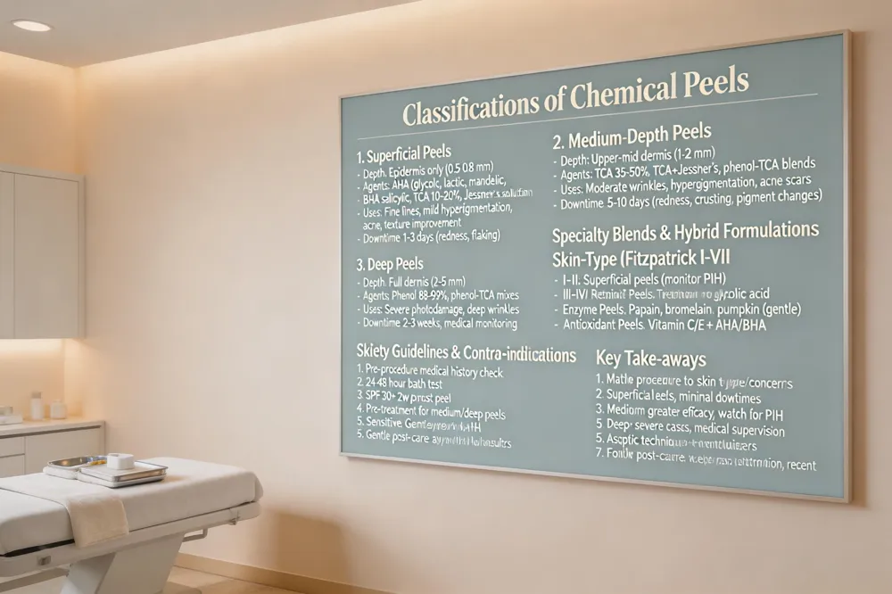 Chemical peels are classified by the depth of skin they affect, which determines both the results and the recovery time. Superficial (light) peels target only the epidermis and are typically formulated with alpha‑hydroxy acids (AHAs) or beta‑hydroxy acids (BHAs) such as glycolic, lactic, or salicylic acid. They improve mild discoloration, fine lines, and overall brightness with minimal downtime (1‑3 days). Medium‑depth peels penetrate into the papillary dermis, using higher concentrations of glycolic acid, trichloroacetic acid (TCA), or blended Jessner’s solutions. These address moderate wrinkles, deeper hyperpigmentation, and acne scarring, and require 5‑7 days of healing. Deep peels reach the mid‑reticular dermis (often with high‑strength TCA or phenol) and provide dramatic resurfacing for severe photo‑damage and deep scars, but they demand 2‑3 weeks of recovery and careful medical monitoring.