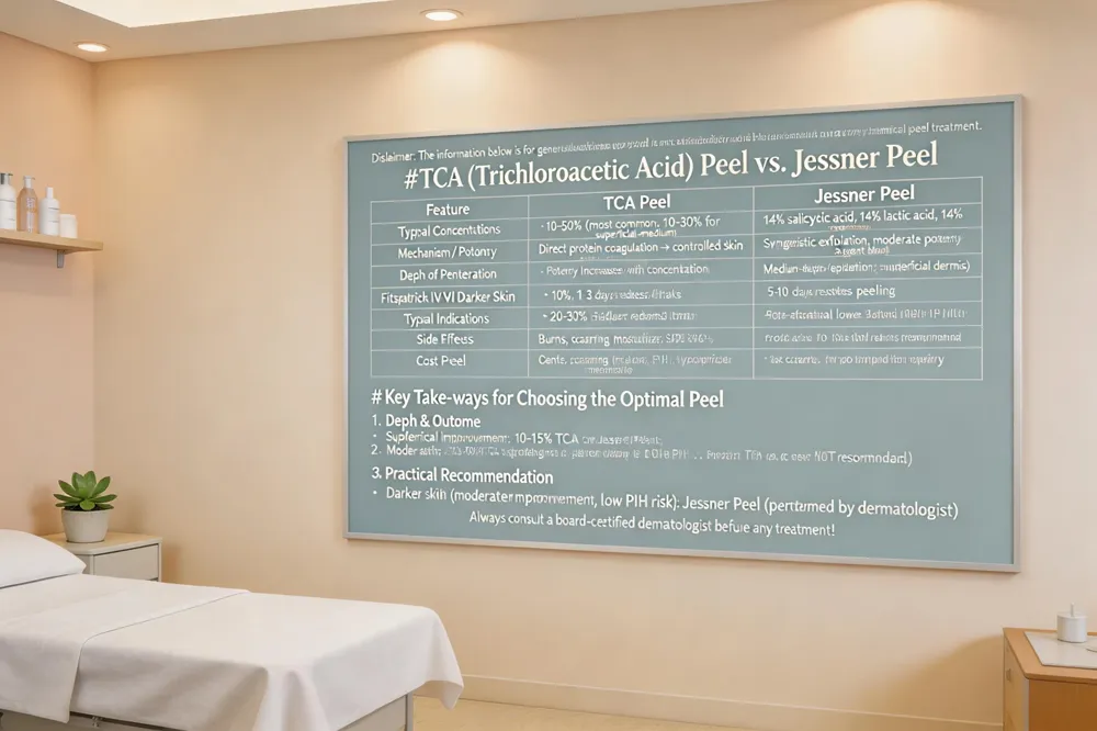 Both TCA peels are effective for fine lines, sun damage, and hyperpigmentation, but they differ in depth, potency, and safety for darker skin. TCA peels can be formulated from superficial (10‑20%) to deep (>50%) concentrations, allowing deeper dermal penetration and more dramatic resurfacing, yet they carry a higher risk of post‑inflammatory hyperpigmentation and scarring in Fitzpatrick IV‑VI skin. Jessner peels combine salicylic, lactic, and resorcinol acids, typically acting at a superficial‑to‑medium depth, making them gentler and better tolerated across all skin tones, especially for acne‑prone or darker complexions. Recovery timelines reflect this: TCA peels may require 5‑14 days of redness, flaking and and possible crusting, whereas Jessner peels usually heal within 2‑5 days with minimal downtime. The right choice depends on your skin type, concerns, and desired downtime; consult a board‑certified dermatologist at On The Spot Dermatology to personalize your peel plan.