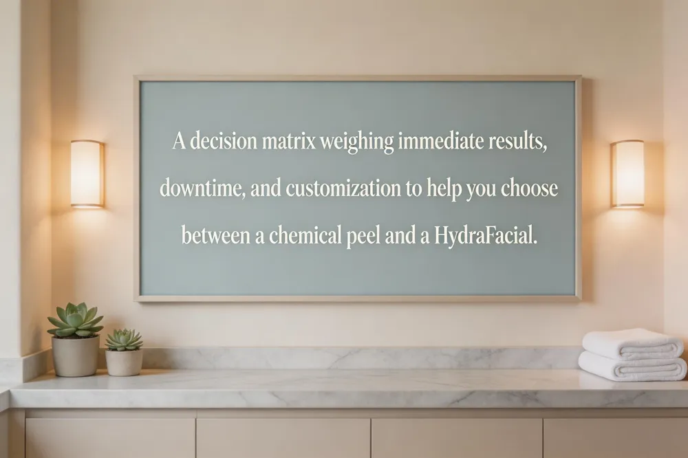 When choosing between a chemical peel and a HydraFacial, consider three key factors. First, immediate results versus long‑term resurfacing: a HydraFacial delivers instant radiance, plumping and pore‑clearing in a single 30‑45‑minute session, while a peel—especially medium‑depth—stimulates deeper cell turnover and collagen remodeling that become visible over weeks. Second, downtime and recovery: HydraFacial has zero downtime; you can apply makeup and resume activities right away. Superficial peels may cause mild redness for a day, whereas medium or deep peels can require 5‑14 days of peeling and sun‑avoidance. Third, customization and booster options: HydraFacial allows tailored serums (antioxidants, peptides, hyaluronic acid, brightening agents) to address specific concerns, whereas peels can be adjusted by acid type and concentration (glycolic, TCA, lactic) for targeted pigment or texture correction.