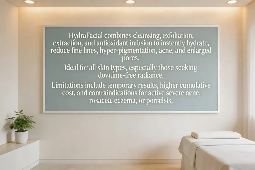 Disadvantages? Active severe acne, rosacea, eczema or psoriasis may flare; results are temporary (a few weeks) requiring regular sessions; cumulative cost can be high; mild redness or irritation may occur in ultra‑sensitive skin; deeper wrinkles or extensive pigmentation often need stronger modalities.