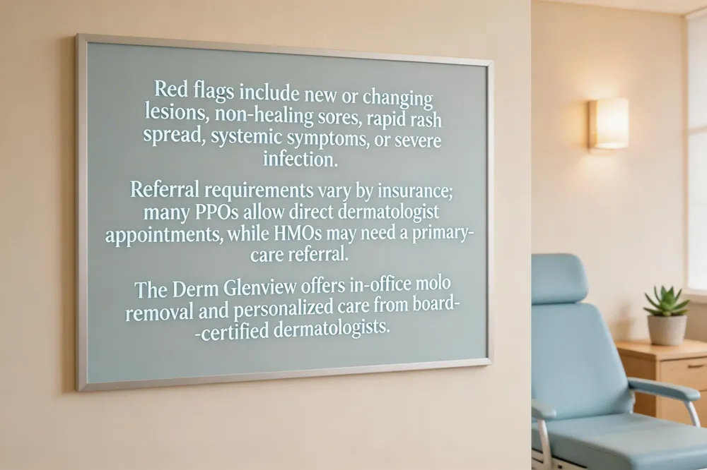 Patients often wonder if a referral is required. With most PPO plans you can book a dermatologist directly, but many Illinois HMO policies still need a primary‑care referral for insurance coverage. The Derm Glenview staff can verify your plan’s rules before scheduling; without a referral you may pay out‑of‑pocket.