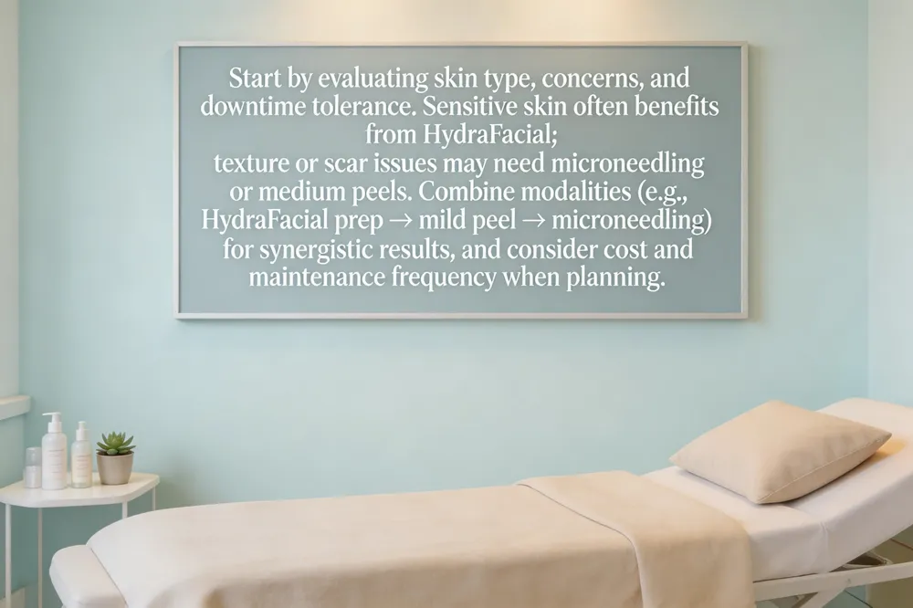 Begin by evaluating your skin type, concerns—fine lines, acne, hyperpigmentation, pore size—and your downtime tolerance. Sensitive skin often benefits from a HydraFacial’s gentle, zero‑downtime approach, while texture issues or scar remodeling may need microneedling or a medium peel with recovery. Combining modalities can boost results: a HydraFacial can prep the skin for a mild peel, and a post‑peel microneedling session can enhance collagen. Consider cost and maintenance; HydraFacials are per visit and ideal for monthly upkeep, whereas microneedling and chemical peels are priced higher but spaced farther apart for improvement.