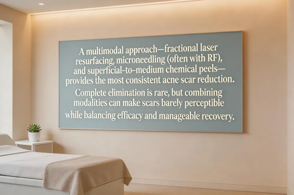 Complete elimination is rare; most patients achieve dramatic reduction but not absolute disappearance. Success depends on scar type (ice‑pick, rolling, boxcar), depth, and individual skin characteristics. Combining lasers, Microneedling, chemical peels, radiofrequency, and fillers can maximize fade‑off, making scars barely perceptible. Realistic expectations and a personalized, dermatologist‑guided regimen are essential for the best outcome.