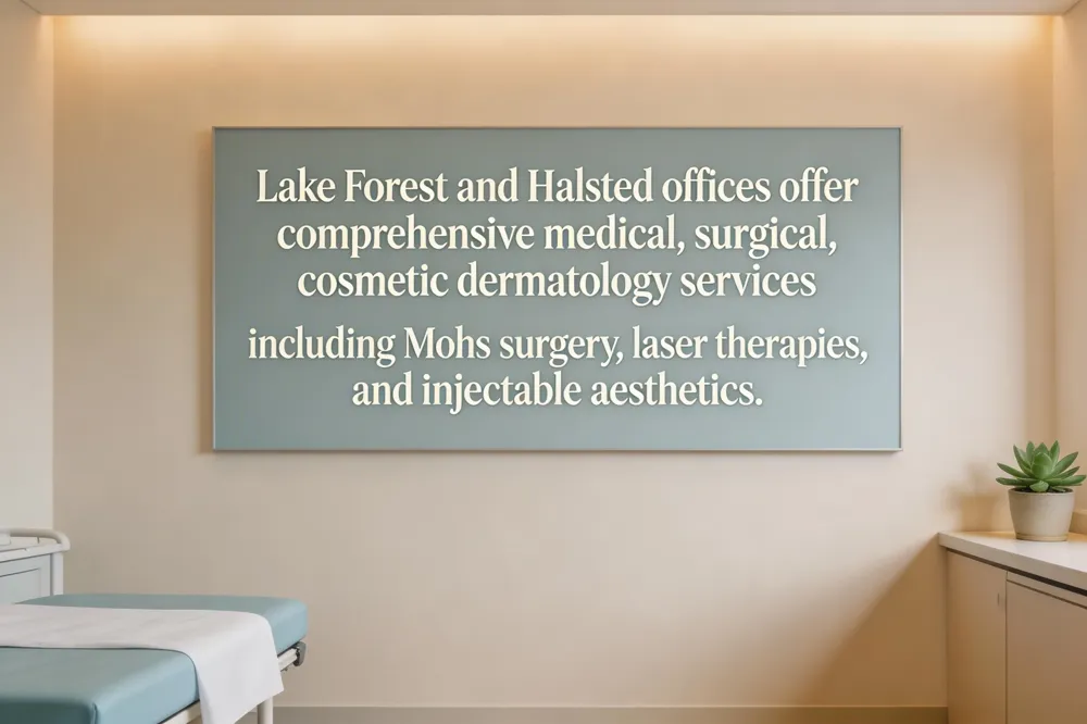 The Skin Care Center’s Lake Forest office, situated on the Northwestern Lake Forest Hospital campus at East Deerpath Road and Oakwood Avenue, offers a full suite of medical, surgical, and cosmetic dermatology services. Board‑certified providers treat acne, eczema, psoriasis, skin cancer, and anti‑aging concerns, and perform Mohs micrographic surgery, laser therapies, Botox®, chemical peels, and facial fillers. Patients from the North Shore, Chicago suburbs, and southern Wisconsin benefit from personalized care and a wide range of accepted insurance plans.