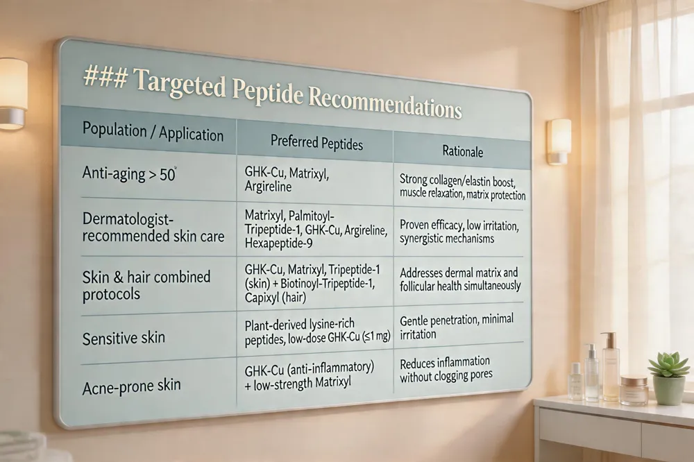 | Sensitive skin | Plant‑derived lysine‑rich peptides, low‑dose GHK‑Cu (≤1 mg) | Gentle penetration, minimal irritation |
