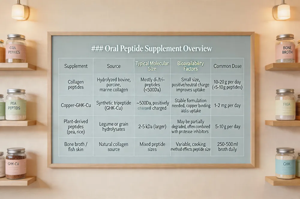 Peptide supplements are oral products that contain short chains of amino acids—most commonly collagen peptides and copper‑GHK‑Cu—intended to support skin structure, hydration, and elasticity. Collagen peptides, derived from hydrolyzed animal collagen, are broken down during digestion into absorbable di‑ and tripeptides that can be taken up by fibroblasts and stimulate new collagen synthesis. Copper‑GHK‑Cu supplements deliver the copper‑binding tripeptide (GHK‑Cu), which has demonstrated anti‑aging and wound‑healing effects when stable in the skin. Bioavailability depends on peptide size, charge, and formulation; smaller, positively charged peptides (< 500 Da) penetrate more efficiently, while larger sequences may be degraded by gastrointestinal proteases. Dietary sources rich in natural peptides include bone broth, fish skin, and legumes. When choosing a supplement, prioritize reputable brands, follow dosage guidelines, and discuss use with a dermatologist, especially for pregnant individuals or those with medical conditions.