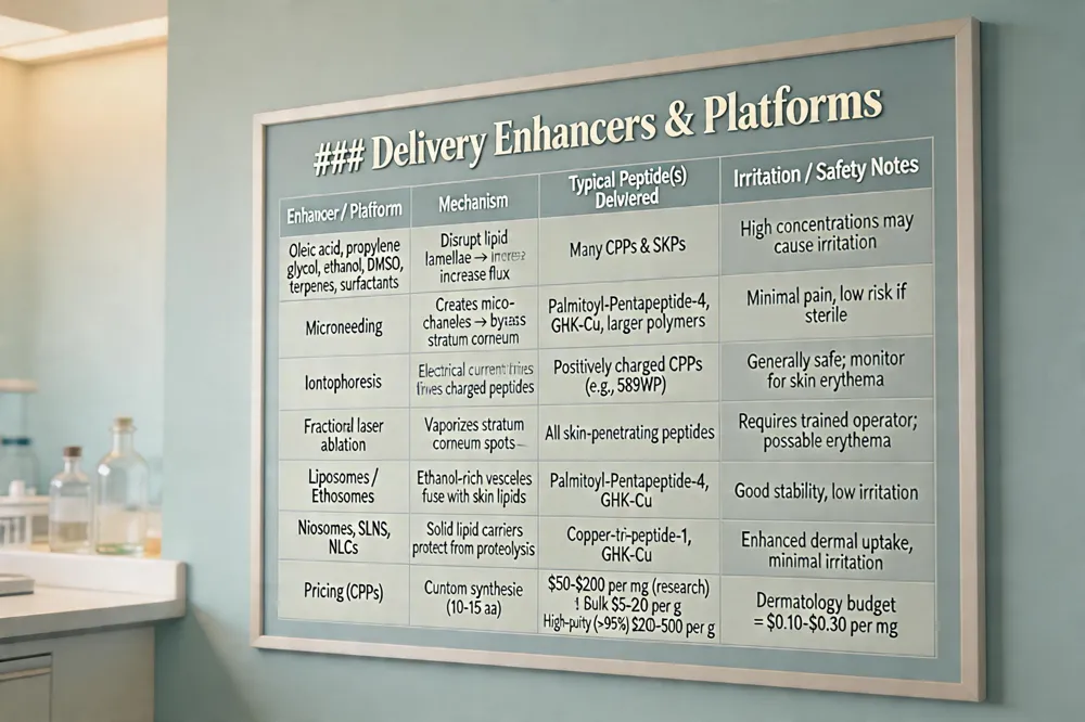 | Enhancer / Platform | Mechanism | Typical Peptide(s) Delivered | Irritation / Safety Notes |