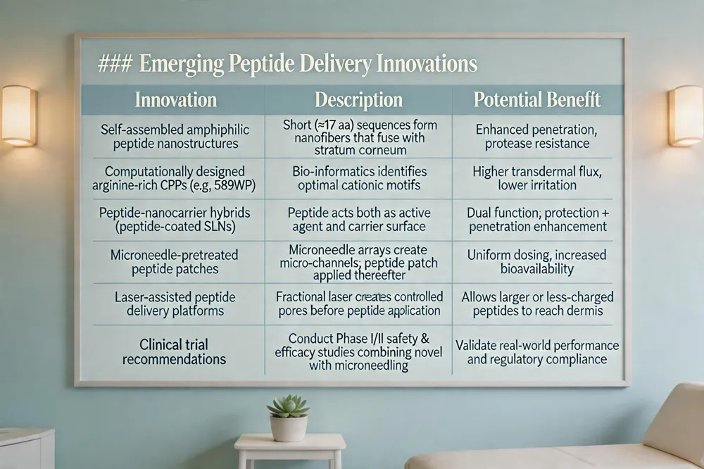 Self‑assembled peptide nanostructures are being engineered to act as both penetration enhancers and nanocarriers. Recent studies showed that short amphiphilic sequences (≈17 aa) can form stable nanostructures that fuse with the stratum corneum, and minor hydrophobic modifications dramatically improve skin‑penetration efficiency and protease resistance. Parallel computational design efforts use bio‑informatics to identify cationic, arginine‑rich motifs (e.g., optimized penetratin derivatives such as 589WP) that exhibit high transdermal flux in vitro and in vivo, guiding the creation of bespoke skin‑penetrating peptides (SPPs). Looking forward, clinical trials are needed to confirm safety, optimal dosing, and real‑world efficacy of these novel delivery platforms, especially when combined with microneedling, laser ablation, or nanocarrier formulations for anti‑aging and therapeutic applications.