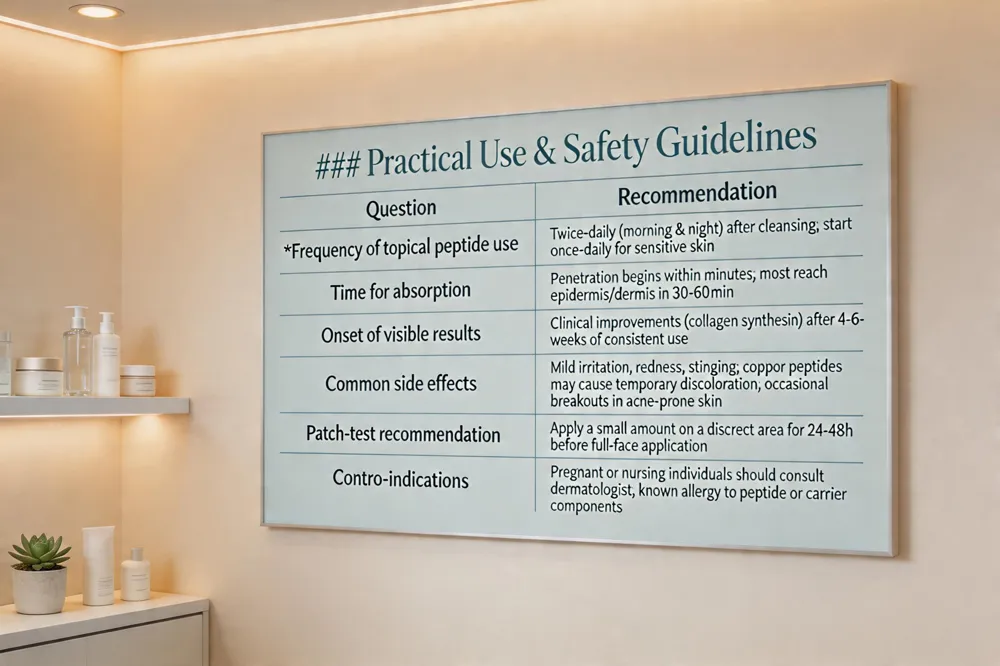 | Frequency of topical peptide use | Twice‑daily (morning & night) after cleansing; start once‑daily for sensitive skin |