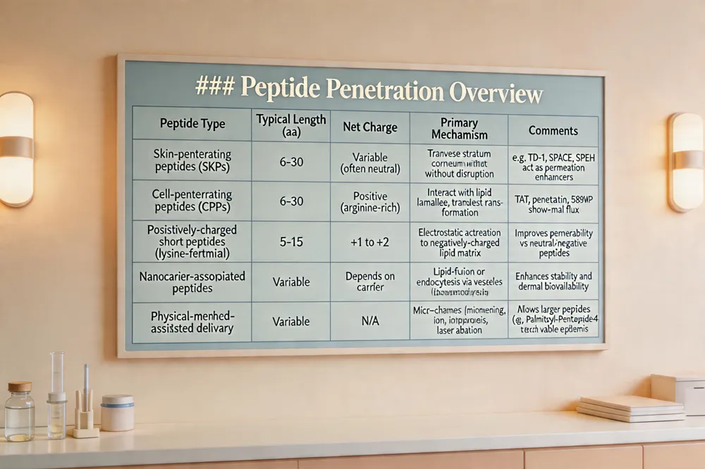 Peptides are too large and hydrophilic to cross the stratum corneum by passive diffusion. Molecules with a molecular weight below 500 Da, a log P (octanol/water) between 1 and 3, and limited hydrogen‑bond donors/acceptors have the highest chance of passive skin penetration. Positively charged peptides (e.g., those containing lysine at the termini) bind more readily to the negatively charged lipid matrix of the skin, improving their permeabilityation compared with neutral or negatively charged peptides. Skin‑penetrating peptides (SKPs) are short peptides (6–30 amino acids) that traverse the stratum corneum without disrupting skin layers such as TD‑1, SPACE, and SPEH act as permeation enhancers, allowing macromolecules like insulin or siRNA to traverse the barrier without disrupting skin layers. Cell‑penetrating peptides (CPPs) – arginine‑rich motifs like TAT, penetratin, and the optimized 589WP variant – can translocate across both cellular membranes and the stratum corneum by interacting with lipid lamellae and creating transient pores. Among CPPs, penetratin and its analog 589WP show the highest transdermal flux and low irritation, making them the best‑performing skin‑penetrating carriers for cosmetic and therapeutic agents. Delivery strategies that combine low‑molecular‑weight, positively charged peptides with nanocarriers (liposomes, ethosomes, solid‑lipid nanoparticles) or physical methods (microneedling, iontophoresis, laser ablation) dramatically improve peptide stability and dermal bioavailability, enabling clinically relevant collagen‑stimulating and anti‑inflammatory effects.
