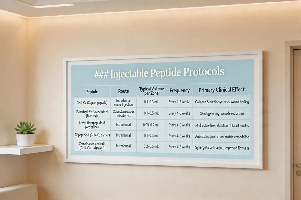 | Palmitoyl‑Pentapeptide‑4 (Matrixyl) | Subcutaneous or intradermal | 0.1‑0.5 mL | Every 4‑6 weeks | Skin tightening, wrinkle reduction |