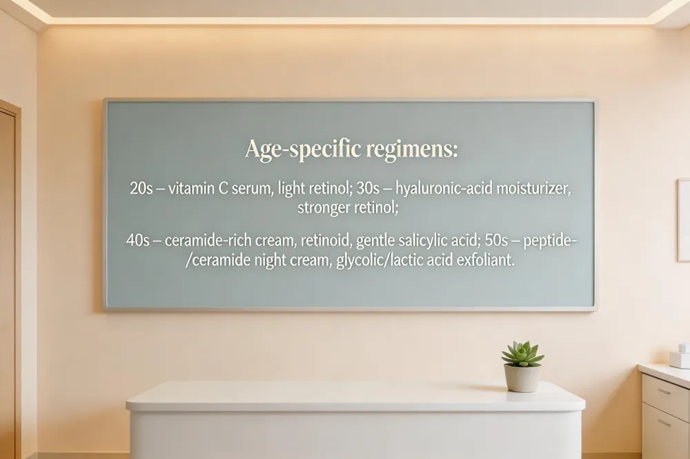 Continue the gentle cleanser and SPF routine. Add a hyaluronic‑acid moisturizer for hydration and a vitamin C serum for brightening. Evening chemical exfoliation (AHA or BHA) 2–3 times weekly promotes collagen synthesis. Use a pea‑sized amount of retinol at night, paired with a fragrance‑free barrier‑supporting cream.
