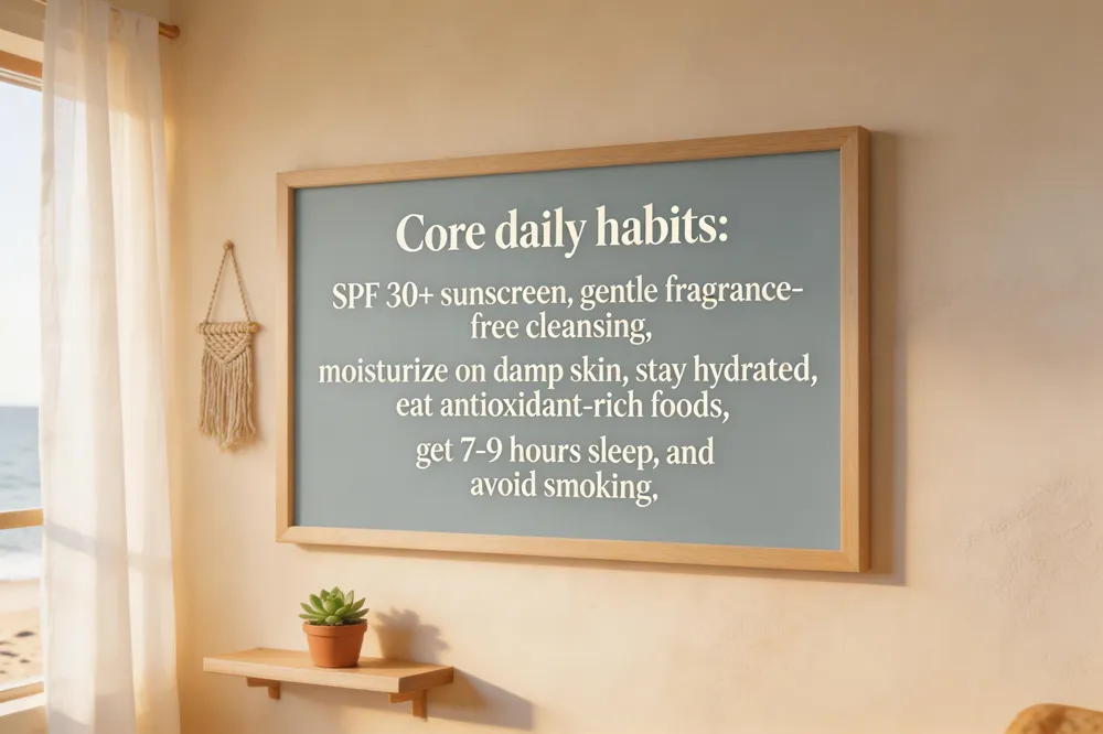 Gentle cleansing with lukewarm water and a mild cleanser preserves natural oils. Follow with a light, skin‑type‑appropriate moisturizer and a broad‑spectrum SPF 30+ sunscreen each morning. Maintain a balanced, antioxidant‑rich diet and drink plenty of water. Quit smoking and limit alcohol to protect collagen and elasticity. Prioritize regular sleep, stress‑reduction techniques, and modest exercise to boost circulation and repair.