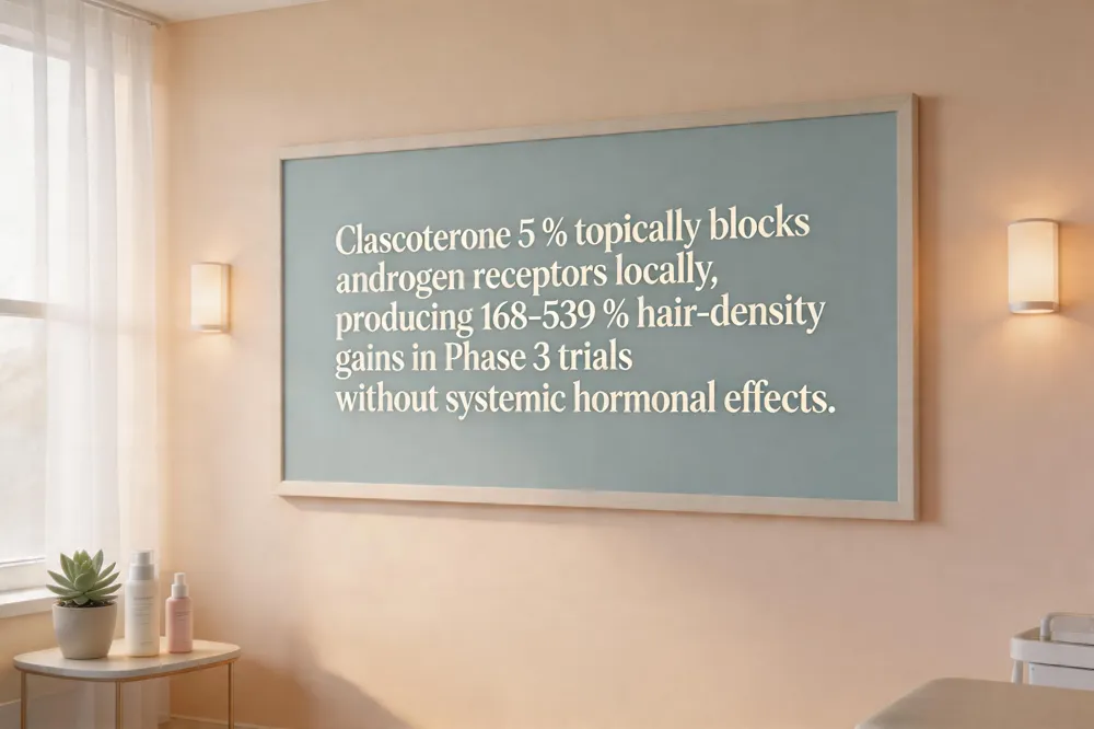 Clascoterone 5 % topical solution represents a breakthrough in the treatment of male androgenetic alopecia by delivering a local androgen‑receptor blockade directly to the scalp. Unlike oral finasteride, the drug works at the follicular level without systemic absorption, thereby minimizing the risk of hormonal side effects. In two identical Phase 3 trials involving a total of 1,465 men, clascoterone produced remarkable hair‑count increases—one study reported a 539 % rise and the other a 168 % rise in target‑area hair density compared with vehicle. Participants also reported high satisfaction and visible regrowth as early as two months. The safety profile was comparable to placebo, with only mild, transient skin irritation and no measurable changes in serum testosterone or DHT. An ongoing safety follow‑up is expected to be completed later this year, after which the sponsor plans to submit a New Drug Application. If approved, clascoterone could become the first new, first‑in‑class topical anti‑androgen for hair loss in over three decades, offering a non‑systemic alternative to existing therapies.