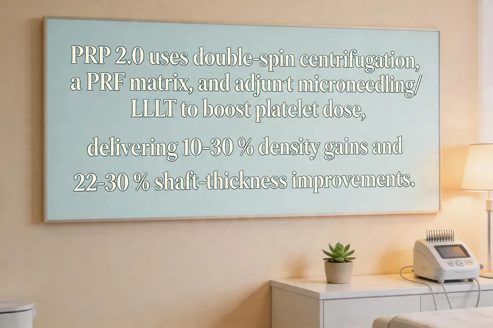 PRP 2.0 builds on the first‑generation technique by using double‑spin centrifugation for higher platelet doses, adding platelet‑rich fibrin (PRF) for a sustained release matrix, and pairing injections with microneedling or low‑level laser therapy to boost follicular stem‑cell activation.