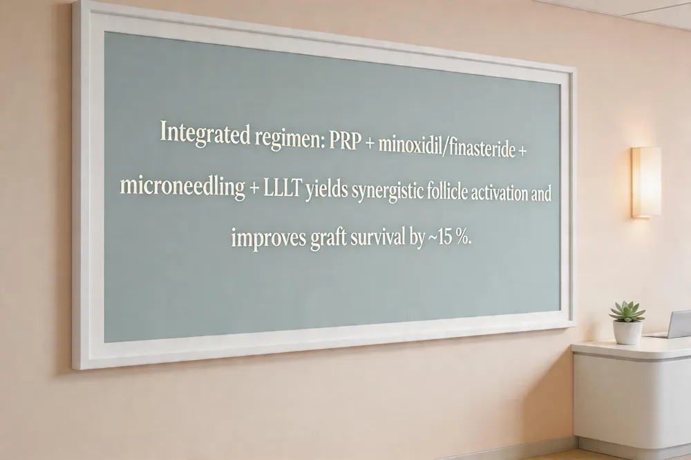 Synergy between PRP and topical minoxidil/finasteride is now a cornerstone of personalized hair‑restoration. PRP delivers autologous growth factors that reactivate dormant follicle stem cells, while minoxidil extends the anagen phase and finasteride reduces DHT‑driven miniaturization; together they produce greater increases in density than either alone. Low‑Level Laser Therapy (LLLT) and microneedling serve as adjunctive boosters—LLLT improves scalp microcirculation and stimulates cellular metabolism, whereas microneedling creates micro‑channels that enhance topical drug and PRP penetration. In transplant patients, PRP applied intra‑operatively and during post‑operative maintenance has been shown to raise graft survival by roughly 15 % and improve overall follicular unit density. A practical, personalized regimen might begin with three monthly PRP sessions combined with daily minoxidil 5 % and oral finasteride 1 mg, followed by microneedling (0.5 mm) and LLLT twice weekly for six weeks, then maintenance PRP every 6–12 months. This multimodal approach leverages complementary mechanisms to maximize follicle health, scalp vascularity, and long‑term regrowth outcomes.