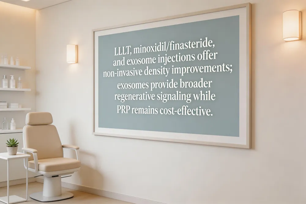 Low‑level laser therapy (LLLT) is FDA‑cleared, non‑invasive and uses red/near‑infrared light to boost scalp microcirculation and cellular metabolism, often increasing density 10‑30 % after 3‑6 months. Topical agents such as minoxidil and oral FDA‑approved finasteride (or dutasteride) remain first‑line medical options, while nutraceuticals and anti‑inflammatory scalp cleansers support follicle health. Compared with PRP, exosome therapy delivers extracellular vesicles packed with growth‑factor proteins and microRNAs, offering broader regenerative signaling and fewer treatment sessions; PRP provides a lower‑cost, autologous platelet boost that is well‑studied for early‑stage thinning. Patient‑reported outcomes show higher satisfaction with exosomes for rapid regrowth, though PRP scores remain strong for safety and affordability. Reddit threads echo these trends: users praise PRP’s consistency and exosomes’ potency despite higher price. Overall, the best PRP alternatives combine Low‑level laser therapy (LLLT) , topical/oral medications, and, when appropriate, exosome injections to deliver personalized, non‑surgical hair restoration for many patients.