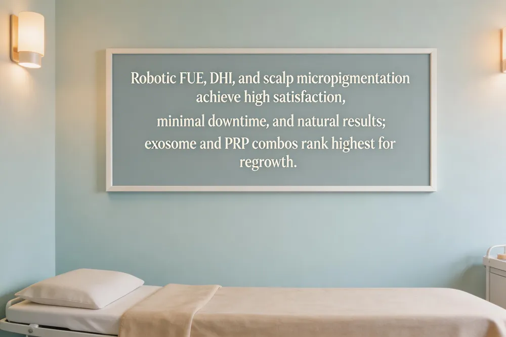 Advanced FUE techniques (UFME, DSHI, robotic FUE) receive high satisfaction scores for one‑day procedures, minimal downtime, natural results, and pricing around $5‑$6 per graft. Adding scalp micropigmentation and AI‑guided planning further enhances visual density and overall patient confidence.