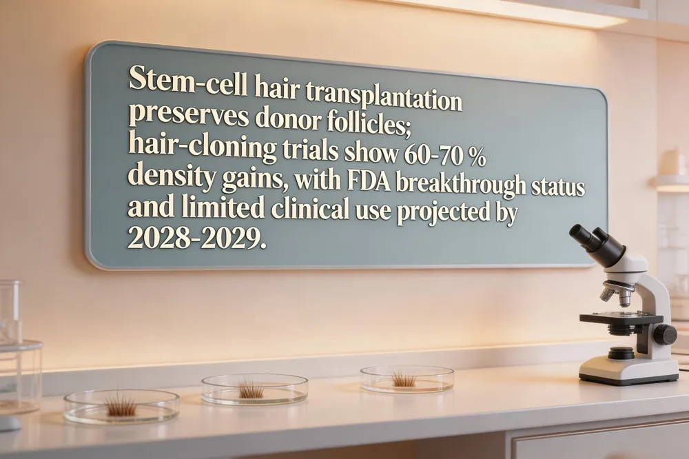 Latest news: 2026 Phase II trials by companies such as ReplicHair and FollicleTech showed 60‑70 % density increases after three months, earning FDA “Breakthrough Device” designation. Limited physician‑administered procedures may appear by 2028‑2029, but widespread availability remains years away.