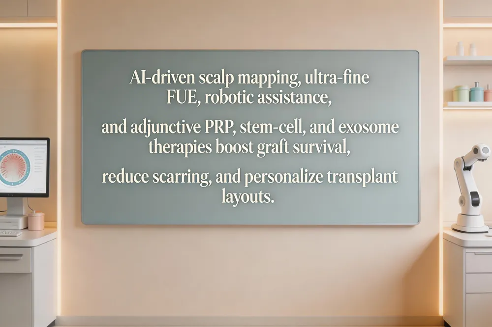 Continued innovation beyond PRP includes robotic‑assisted ultra‑fine extraction (UFME), direct simultaneous hair implantation (DSHI), AI‑driven donor mapping, and adjunctive exosome or stem‑cell‑enriched boosters. Patients report natural‑looking results, rapid healing, and high satisfaction with these multimodal protocols, positioning them as the new gold standard for advanced hair restoration.