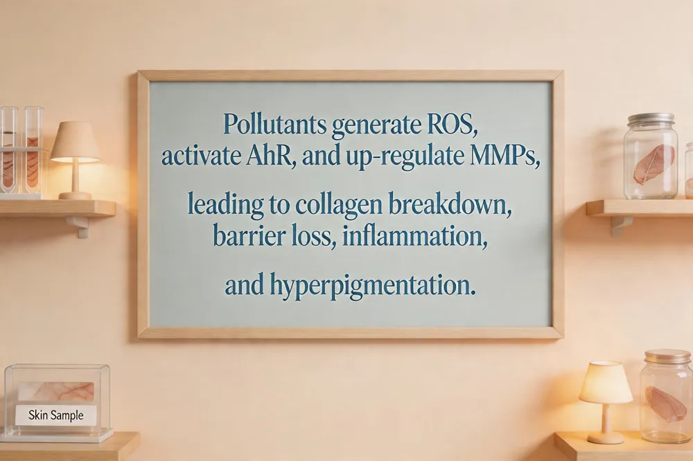 Effects of air pollution: Fine particles (PM2.5) and ozone generate reactive oxygen species that degrade collagen, increase transepidermal water loss, and trigger inflammation, accelerating wrinkles, hyperpigmentation, and acne. UV exposure amplifies these effects, underscoring the need for combined antioxidant, barrier, and sunscreen strategies.