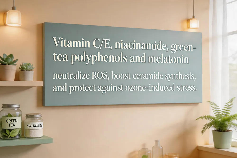 Urban air pollutants—PM2.5, ozone, VOCs, PAHs—generate free radicals that overwhelm the skin’s natural defense, degrade collagen, and impair the barrier, leading to premature aging, hyperpigmentation, and inflammation. A daily regimen that begins with a gentle, pollutant‑removing cleanser removes surface particles and prevents clogged pores. Follow with a leave‑on serum rich in vitamin C and vitamin E, which scavenge ROS and restore depleted antioxidants; niacinamide and green‑tea polyphenols further calm low‑grade inflammation and boost ceramide synthesis. Ferulic acid stabilizes vitamin C, while resveratrol and melatonin provide broad‑spectrum protection against ozone‑ and blue‑light‑induced oxidative stress. Combining water‑soluble and lipid‑soluble agents into a topical antioxidant blend maximizes skin penetration and neutralizes a wide range of radicals. Barrier‑repair moisturizers containing ceramides, hyaluronic acid, and fatty acids seal in moisture and limit pollutant penetration. Finally, a broad‑spectrum sunscreen (SPF 30‑50) shields against UV‑driven photo‑oxidation, but it does not replace antioxidant serums or barrier creams for pollution defense.